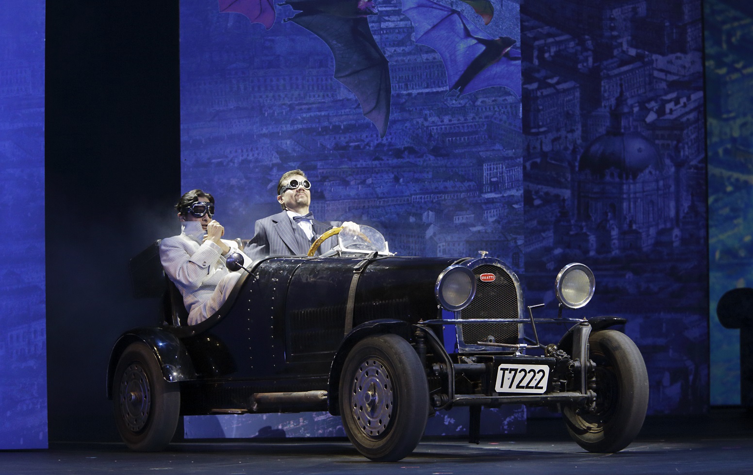 Esirippu nousee, uljas musiikki soi – ja lavalla kuorsaa humalainen äijä. Hän on vanginvartija Frosch, jonka pitäisi tulla lavalle vasta kolmannessa näytöksessä, mutta hän toimii nyt puheroolissa saksankielisen oopperan suomenkielisenä kertojana. Pian lavalle ajaa avomallinen automobiili, jossa istuu kaksi herrasmiestä ajolasit päässään.