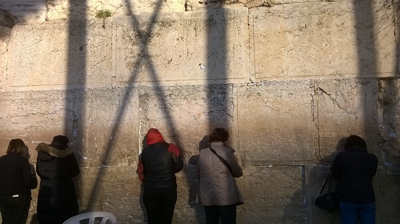 Pääsimme muurille turvatarkastuksen läpi. Muurin edusta on jaettu miesten ja naisten puoliin. Muurin rakoset ovat täynnä lappuja, joihin rukoilivat ovat kirjoittaneet pyyntöjään. Halutessaan voi myös mennä opastetulla kierrokselle maan alle Itkumuurin tunneleihin.