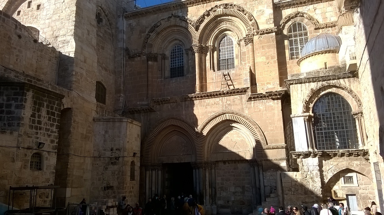 Kirkko on jaettu sisältä roomalaiskatolisen, ortodoksisen, Armenian apostolisen kirkon ja koptilaisen kirkon osiin sekä katolla on Etiopian ortodoksinen kirkko. Jonotimme kirkossa lopuksi Jeesuksen kuolinluolaan, jonne munkki päästi kerralla sisälle vain muutaman ihmisen.