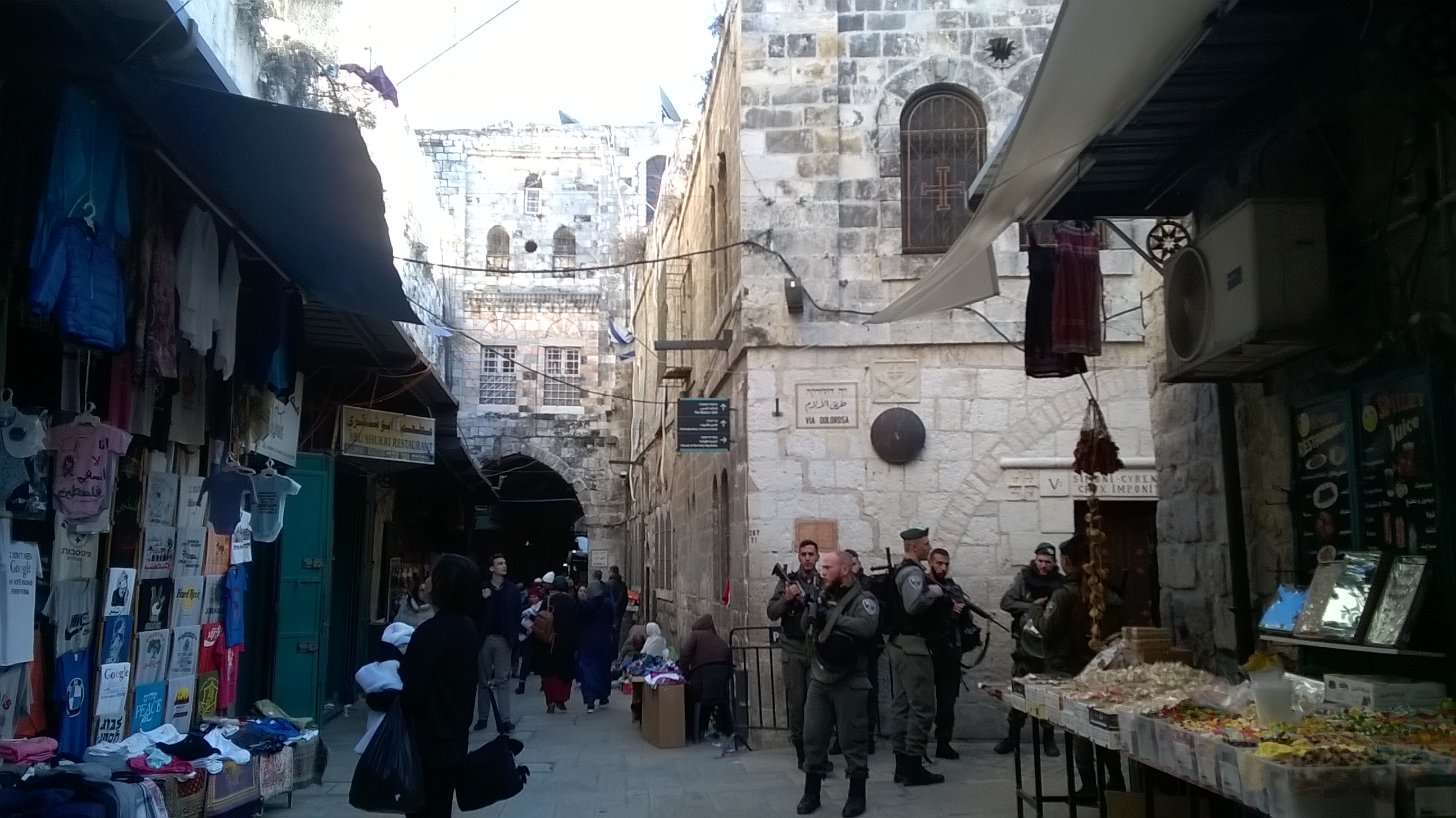 Jo vanhassakaupungissa vaeltelu on elämys. Vanhakaupunki jakautuu neljään eri kortteliin: kristittyjen, juutalaisten, armenialaisten ja muslimien. Koska Jerusalemin vanhakaupunki on näin monen uskonnon ja kansan pyhä paikka, on ilmassa jännitteitä. Kaikkialla kulkikin sotilaita rynnäkkökiväärit olallaan.