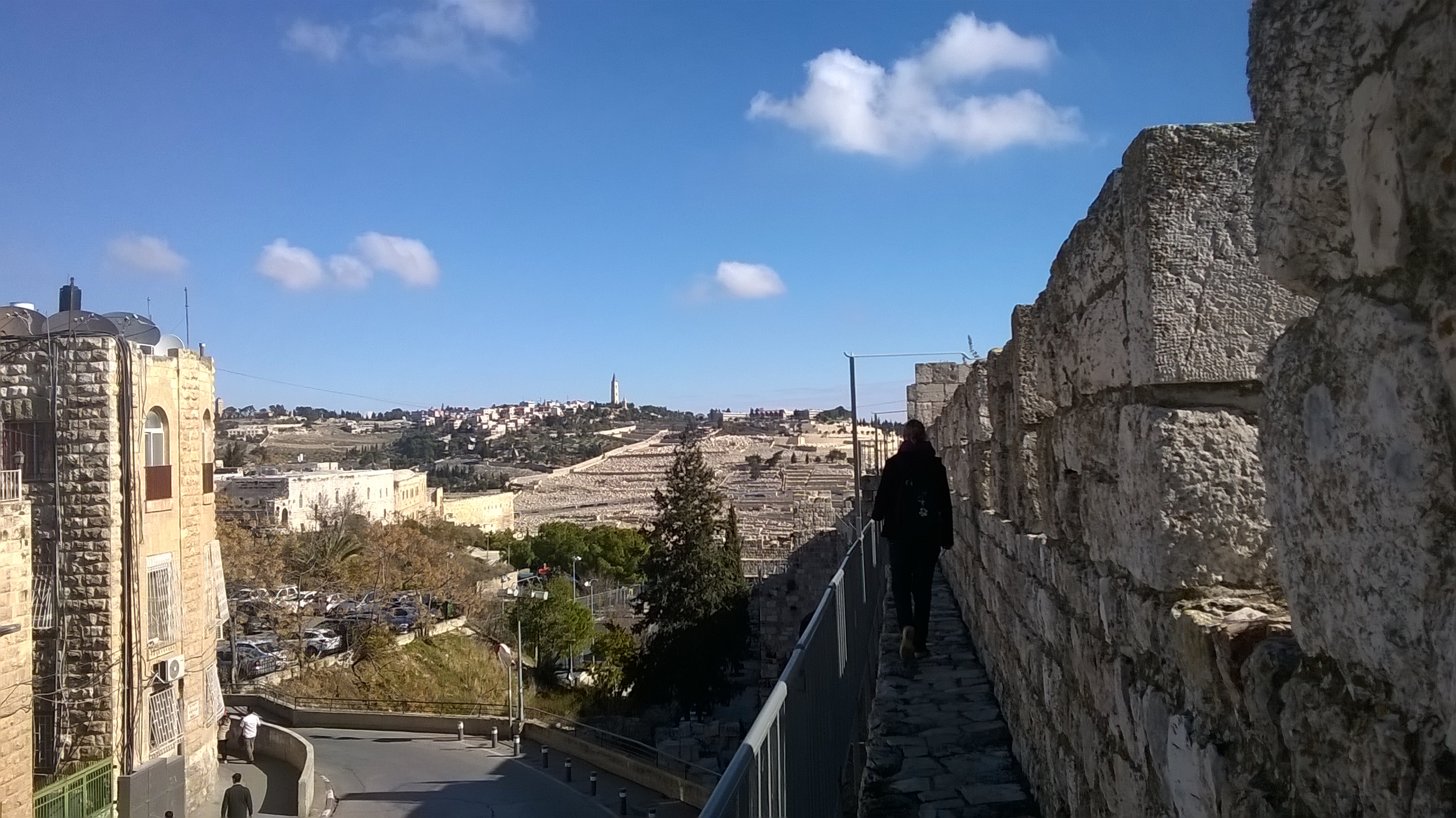 Suuntasimme vuoden 2017 ensimmäisenä päivänä uudestaan Jerusalemin vanhaankaupunkiin, nyt Jaffa-portista. Ostimme liput muurille ja nousimme kävelemään 1500-luvulla rakennetun muurin päälle. Muuria pitkin voi kiertää koko vanhankaupungin ja laskeutua alas jonkin porteista kohdalla. Muurilta on hienot maisemat niin Jerusalemiin kuin vanhaankaupunkiin.