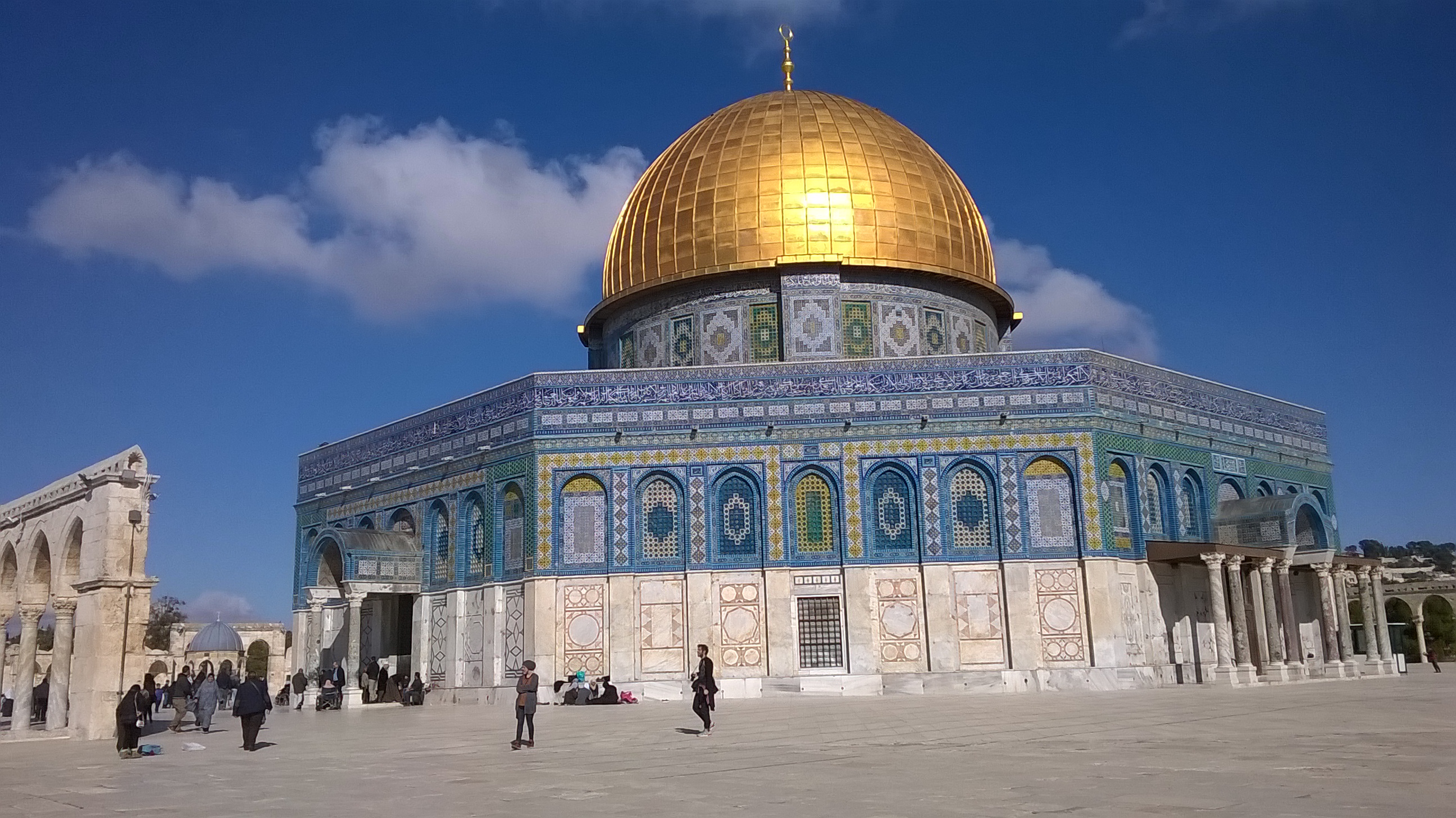 Kun portit avattiin, jono liikkui nopeasti turvatarkastuksen läpi. Kultakupolinen Kalliomoskeija on koko Jerusalemin symboli. Kaunis moskeija valmistui vuonna 690. Se kohoaa Temppelivuorella ja sijaitsee paikalla, josta Muhammedin uskotaan nousseen taivaaseen. Kalliomoskeijan vieressä on Jerusalemin suurin moskeija Al-Aqsa. Kumpaankin moskeijaan pääsevät sisälle vain muslimit. Kun tunti oli kulunut, vartijat häätivät meidät pois Temppelivuorelta.