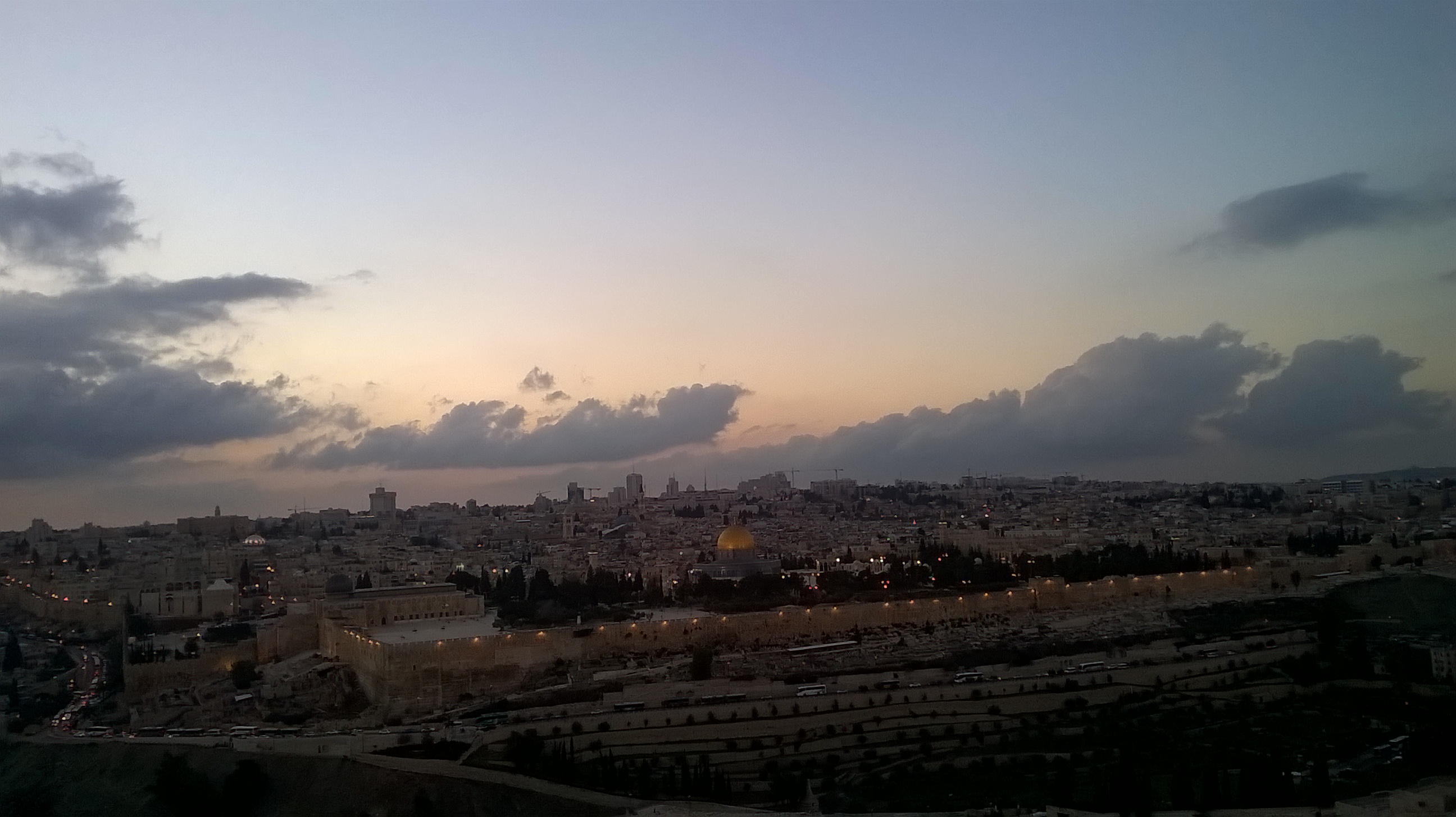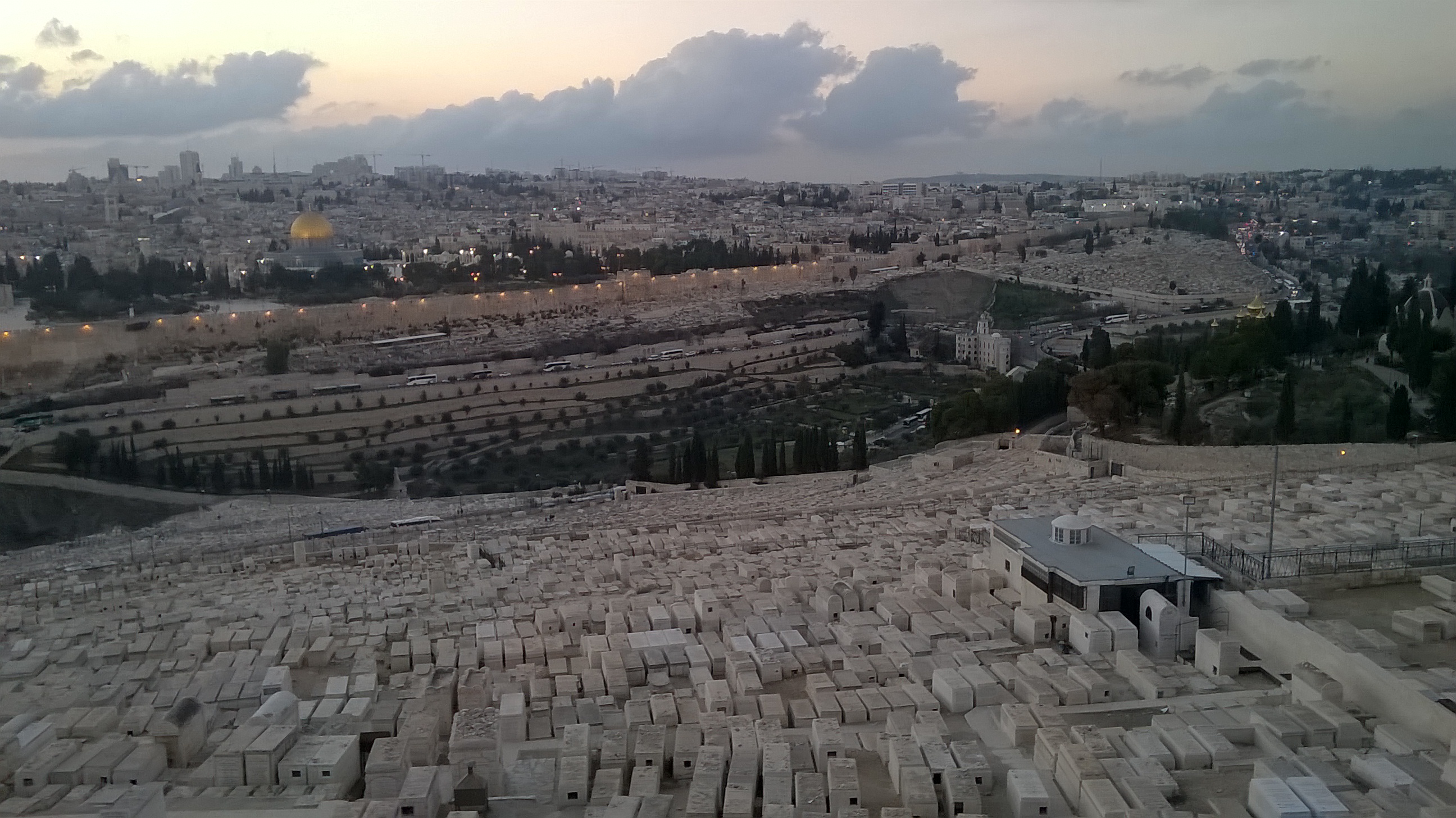 Söimme yhdessä vanhankaupungin basaarin lukuisista falafel-katukeittiöistä, ja suuntasimme sitten vanhankaupungin lähellä olevalle bussiasemalle. Matkasimme bussilla ylös Öljymäelle, joka tunnetaan myös nimellä Oliivivuori. Jäimme bussista pois The Seven Arches hotellin näköalatasanteella. Saavuimme paikalle juuri auringonlaskun aikaan kuvaamaan klassista Jerusalem-postikorttimaisemaa alla levittäytyvästä juutalaisesta hautausmaasta ja kaupungista. Samaan aikaan mineraateista kuului rukouskutsu muslimeille.