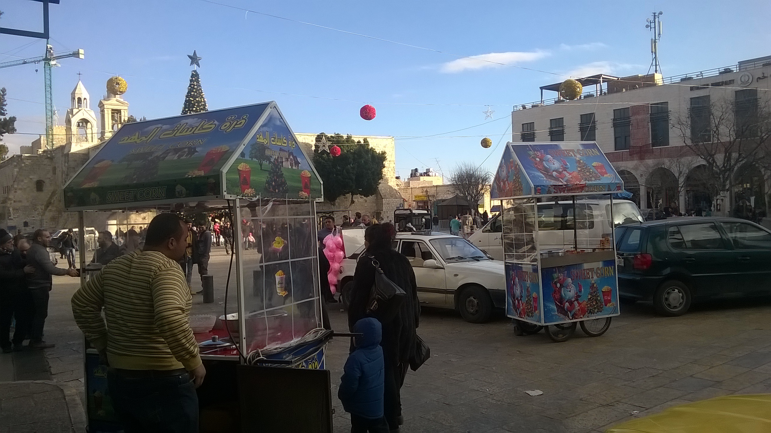 Aukion luona on molemmin puolin turisti-infot, joissa molemmissa kävimme. Toisen infon työntekijä auttoi meitä nostamaan automaatista Israelin sekeleitä, koska emme halunneet nostaa dinaareita yhden päivän matkan takia. Aukiolla oli myös paljon uskonnollisia joulutavarakauppoja, joissa myytiin myös hurjia postikortteja sodan kauhuista.