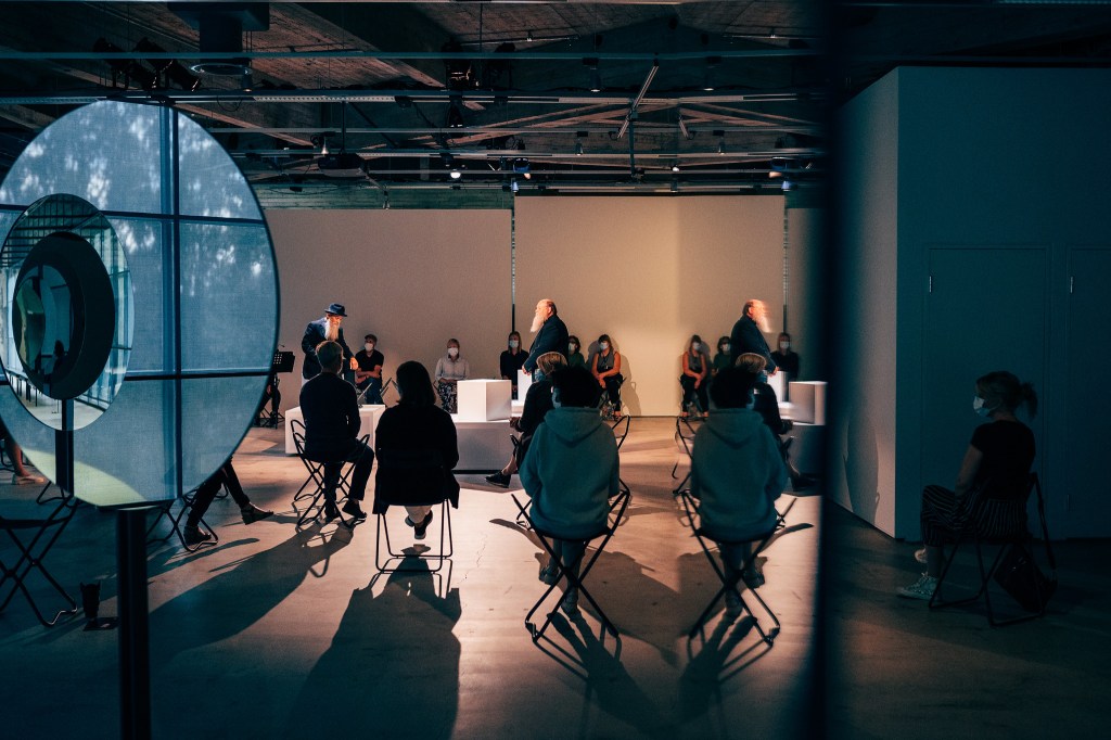 Paavo liittyi seuraani ravintolassa, ja vähän ennen kuin museo meni muilta kävijöiltä kiinni seitsemältä, pääsimme istumaan toiseen kerrokseen näyttelitilaan asetelluille tuoleille. Yleisö istui tuoleilla ja jakkaroilla puoliympyrän muodossa, ja näyttelijät esiintyivät keskellä lattialla, jossa oli heille myös kolme koroketta. Esityksessä käytetään tilaa hyvin hyödyksi, kuten kun näytelmän vahtimestari kiertää salia.