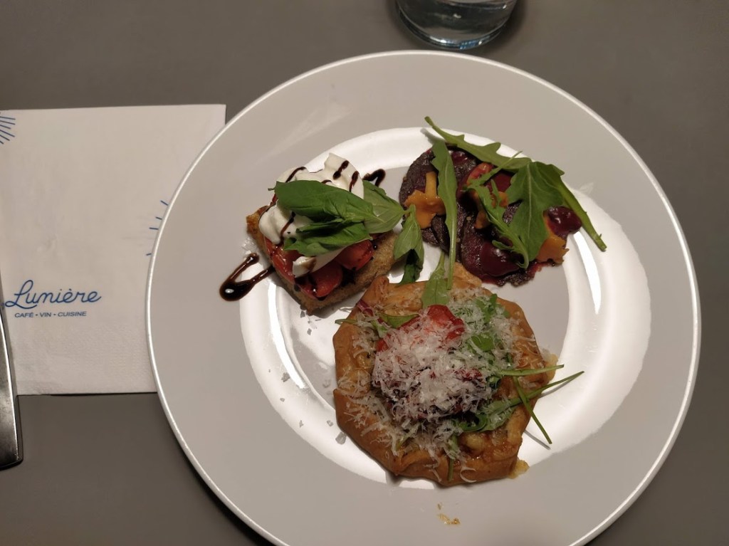 Näyttelykeskus WeeGeen ravintola Lumière WeeGee oli myös auki seitsemään asti, ja olin tilannut etukäteen näytöspäivinä tarjolla olevan 15 euron hintaisen, herkullisen Teatteripaletti-menun. Kahvilan vitriinissä oli muutenkin esillä hyvännäköisiä kakkupaloja, täytettyjä leipiä ja suolaisia piirakoita.