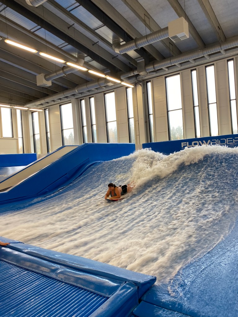 Meillä oli surffauksessa erinomainen ohjaaja, joka piti huolta meistä koko ajan. Mulla kesti oppia, että lautaa ja jalkoja tarvitsee nostaa ja laskea vain vähän, jolloin lauta jo liikkuu eteen- tai taaksepäin. Aluksi sahasin hyökyaallonmuotoista allasta vauhdilla ylös-alas ja meinasin tulla altaan reunan yli. Opin myös taivuttamaan lautaa niin, että liikuin vasemmalle ja oikealle. Olisi hauska mennä sisäsurffaamaan uudestaankin, nyt rauhallisimmin ottein!