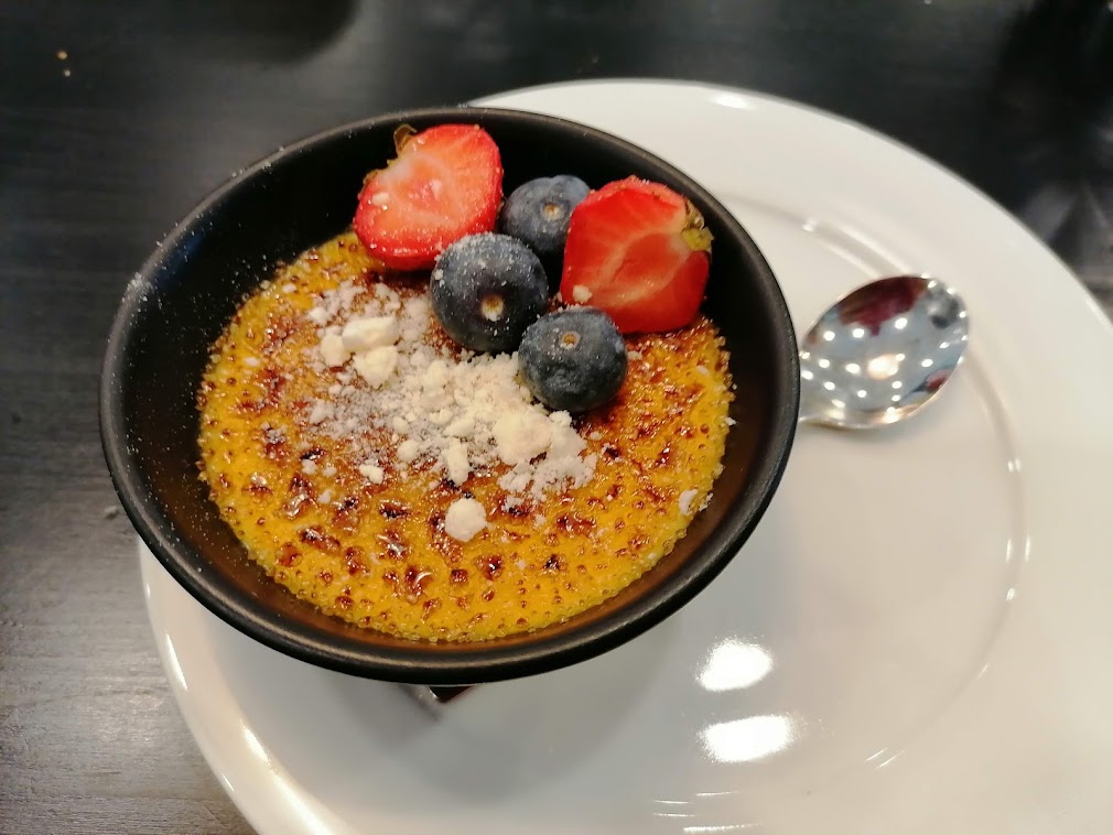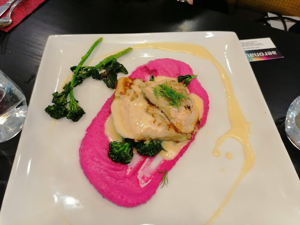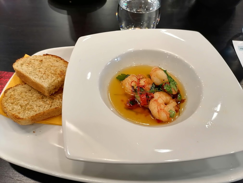 Pääsimme lopuksi syömään maittavan kolmen ruokalajin lounaan Aeronautica Arenan uudessa Bar & Bistro AeroNamNamissa. Ravintola on korkeatasoinen, ei siis mikään tavallinen urheiluhallin kahvio. Saimme nauttia siellä myös ennen urheilusuorituksia kahvia, sienipiirakkaa ja omenapiirakkaa, mitkä olivat tosi hyviä. Ravintolan sisäikkunoista voi seurailla alapuolella tapahtuvaa sisäsurffausta ja lentämistä. Lounaalla söin alkupalaksi jättikatkarapuja öljyssä, pääruuaksi sienimureketta sherryllä ja shalotilla sekä jälkiruuaksi kahvin kanssa crème brûléen. Oi että, todellakin nam nam!