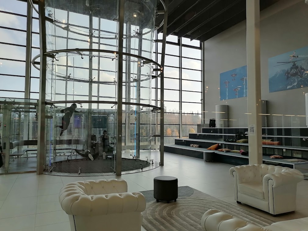 Meillä oli apunamme Aeronautican asiantuntevat työntekijät, ja kilpalentäjä Matti Miilumäki lensi mukanamme. Saimme jokainen lentää kaksi kertaa tuulitunnelissa. Miilumäki lennätti meidät myös pari kertaa ympäri kieppuen ylös tunnelin kattoon asti (tämä on ekstrapalvelu, joka ei kuulu tavallisen lennon hintaan). Tunneli on kokonaan läpinäkyvä, joten ylhäältä aukeavat hyvät maisemat, jos niitä nyt kykenee ihailemaan. Lisäksi tunnelin lattiassa on ritilä, joka kestää isommankin painon, mikä on hyvä, koska ritilän alta aukeaa syvä pudotus.