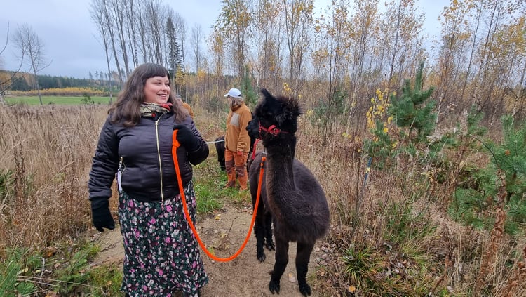 Tämän jälkeen koittikin odottamani alpakkavaellus! Sari Ketosara ja hänen puolisonsa Juha pyörittävät Merikeinun alpakoita Haminan Husulassa sijaitsevalla Vuorenpään tilalla. Kuka tahansa on tervetullut käymään tilalla ajanvarauksella. Nyt kolme tilan kahdeksasta alpakasta oli saapunut Aholafarmille. Sain taluttaa vuorotellen porukan vaaleaa johtajaa Suloa sekä kahta toisiinsa kiintynyttä mustakarvaista alpakkaa, Carlosta ja Camilloa (Camillolla on valkoinen kuono).