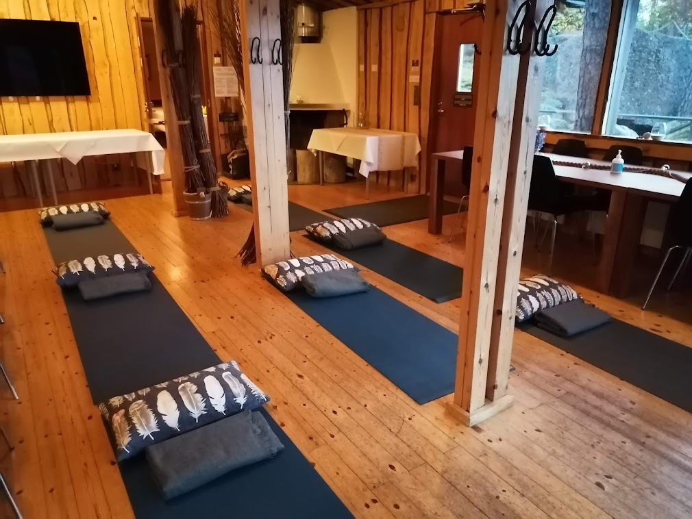 Seuraavana aamuna meillä oli kevyt aamiainen (myslipatukoita, omenia ja jääkahvia) kello kahdeksalta mökkien lähellä sijaitsevassa Luppi-kabinetissa. Puoli yhdeksältä meillä alkoi viereisessä huoneessa, Takkatuvassa, yksityinen joogatunti. En ole yhtään aamuihminen, mutta nautin kyllä Niina Aution vetämästä rentouttavasta, tunnin kestäneestä joogasta. Erityisesti miljöö oli upea kun erähenkisen Takkatuvan isoista ikkunoista aukeni maisema merelle. Ryhmät voivat halutessaan tilata itselleen joogatunnin Santalahti Resortissa (kesällä ei muuten tarvitse maksaa tilavuokraa kun joogan voi pitää ulkona).