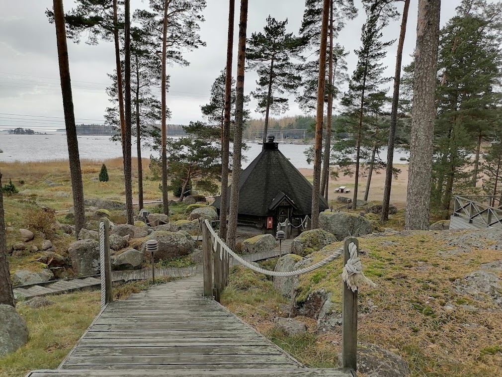 Lasikattoinen ja pyöreän mallinen Santa Glass Sauna on avattu vasta viime kesänä. Saunaan astuttuani tajusin, että muut ryhmästämme istuivat lauteilla uimapuvut päällä, mutta mä olin kylpytakin alla alasti. Saunasta avautuivat ulos upeat merimaisemat, mutta myös kaikki ohikulkevat näkivät sisälle saunaan. Koska olin jättänyt uima-asuni mökilleni asti ja olimme liikkeellä naisporukalla, päätin silti rohkeasti mennä istumaan lauteille nakupellenä. Onneksi lokakuinen arkitiistai on hiljaista aikaa lomakeskuksessa, eikä kukaan kulkenut saunan ohitse.