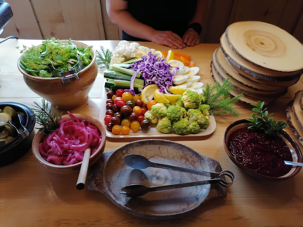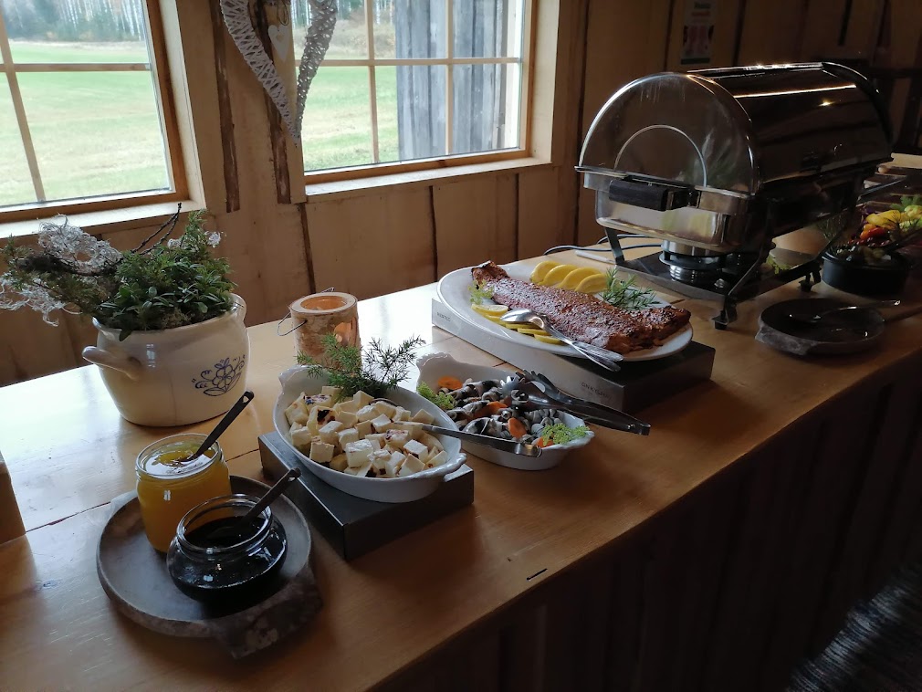 Palattuamme takaisin metsästä, tilataksi vei meidät lähelle tunnelmalliseen ja kauniisti koristeltuun Latopirttiin. Nautimme siellä Aholafarmin emännän yhdessä nuoren apulaisensa kanssa loihtiman hyvinvointilounaan kasvisruokamenulla.
