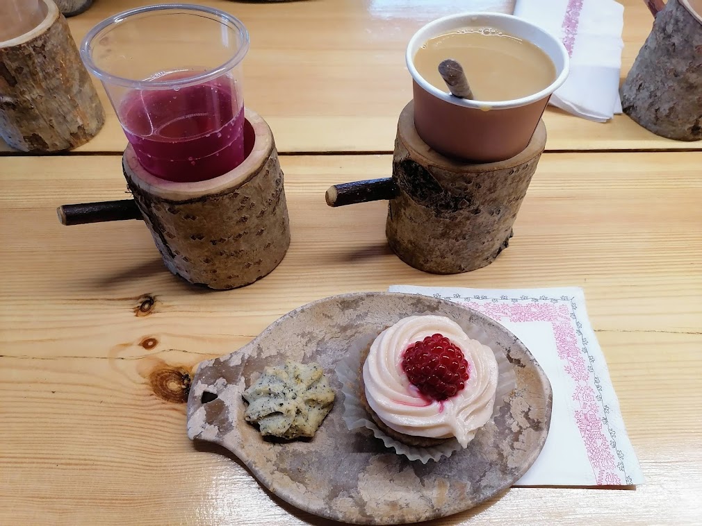 Seisovassa pöydässä riitti herkkuja, kuten syyssalaatti, punajuuripihvit, kesäkurpitsapaistos, suutarinlohi, pippurisavulohi, mummon maustekurkut, luomuleipäjuustot hyytelöillä, nokkossämpylöitä ja sienilevitettä. Juomaksi oli herukka- ja maitohorsmajuomaa. Tyyliin sopien lautaset olivat puiset ja juomat puutuopeissa. Olin aivan napa täynnä syömisen jälkeen, mutta pakko oli vielä ottaa jälkiruuaksi kahvia, vadelmakuppikakku ja mustikkapikkuleipä. Niin hyvää!