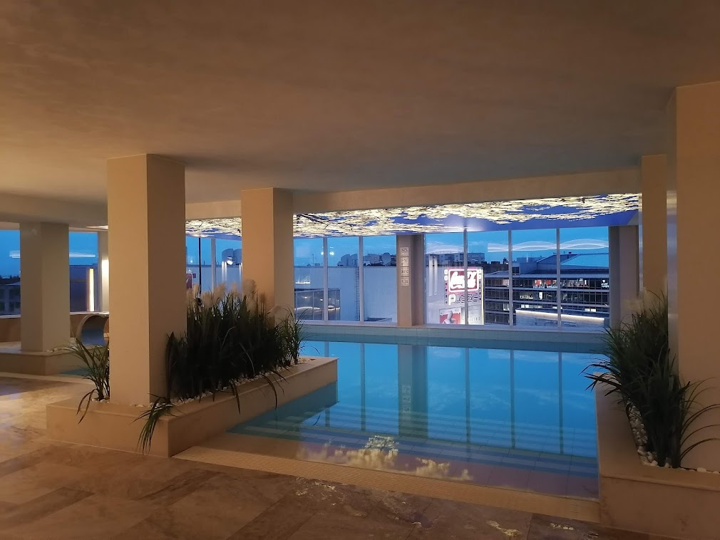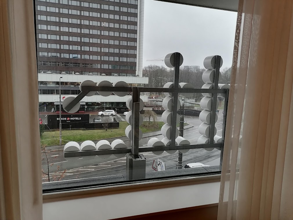Nordic Hotel Forum oli uudistettu sitten edellisen Pöff-majoitukseni kaksi vuotta sitten. Huoneisiin oli tullut muun muassa nätimpi, sadunomainen kuviointi, hienot peilivalot kylpyhuoneessa ja sähköinen ilmoitustaulu, jossa pystyi yhdellä painalluksella ilmoittamaan, haluaako huoneeseensa aamupäivällä siivouksen vai ei. Kävin pari kertaa kahdeksannen kerroksen kylpyläosastolla, jonne oli tullut höyrysauna. Kylpylästä oli jälleen hienot näkymät yli Tallinnan, ja siellä oli hyvin vähän ihmisiä päiväsaikaan. Kylpylästä oli tullut kokonaan itsepalvelukylpylä, jossa pyyhkeetkin olivat valmiiksi esillä napattavaksi.