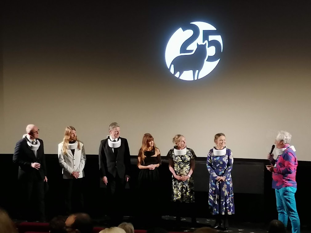 PÖFFin työntekijöillä ja elokuvien kutsuvierailla oli muuten monilla koko kaulan ympäri menevät PÖFFin sponsorin Respirayn BNFF-suojat. Näky on kuin suoraan scifi-elokuvasta: paksusta muovisesta suojasta kaulalla erittyy puhdistettua ilmaa kantajansa kasvoille! Suojan pitäisi tuhota 99 prosenttia viruksista. Sellainen kaulassa voi kenties olla vaikea nojata tuoliin elokuvissa, enkä tiedä, painaako kaulus hartioita, mutta muuten suoja vaikuttaa raikkaammalta ja ilmavammalta vaihtoehdolta kuin hiostavan maskin pitäminen kasvoilla koko päivän.