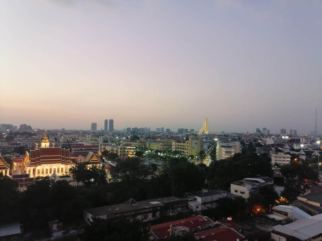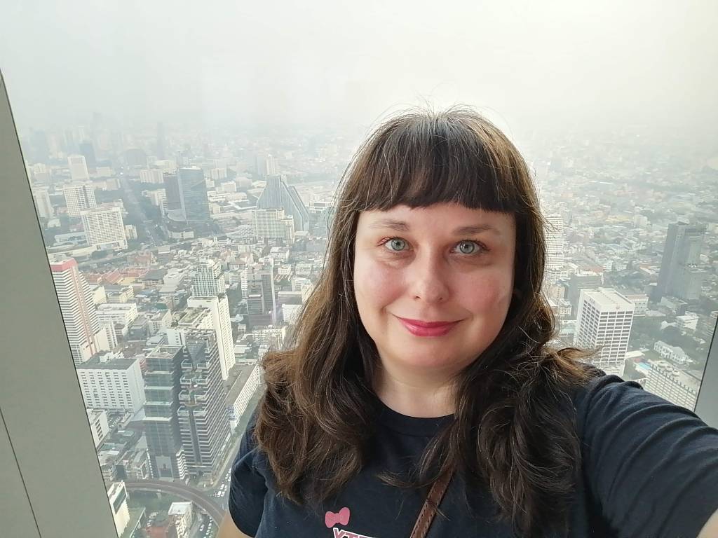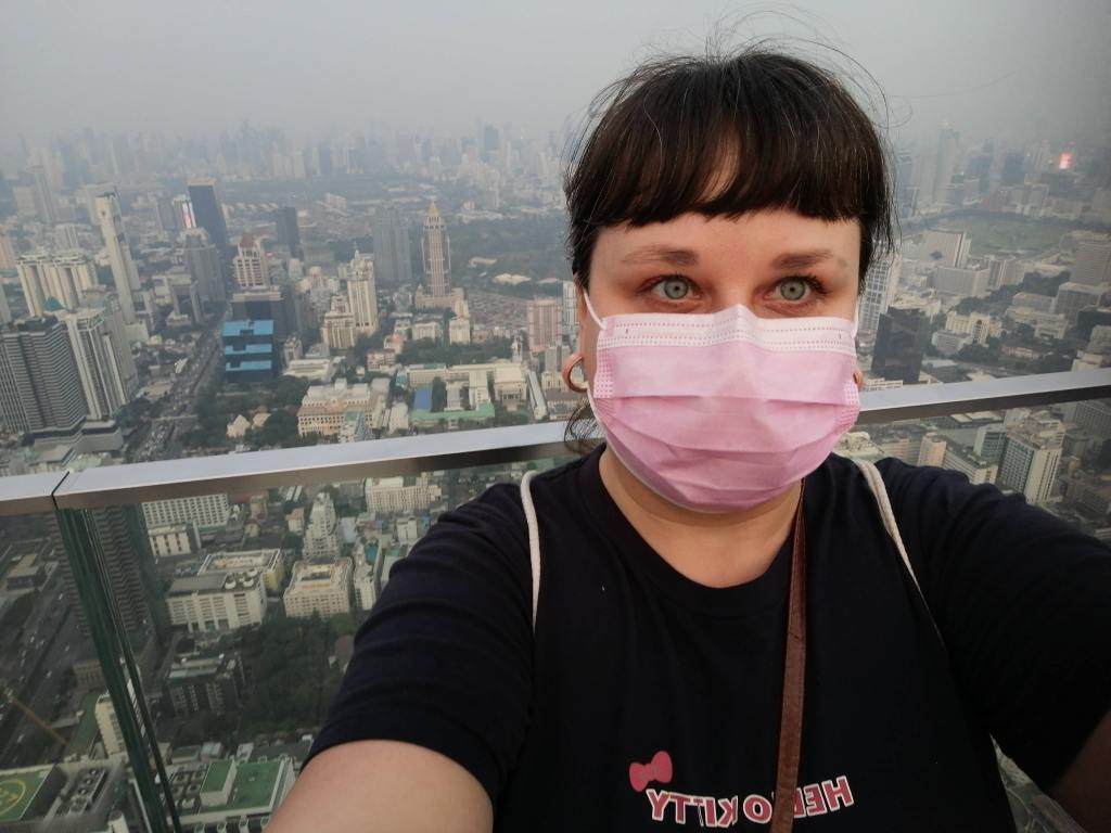 Haluan aina reissuillani päästä katsomaan uutta kaupunkia yläilmoista käsin. Mahanakhoniin törmäsin aivan sattumalta sky trainin Chong Nonsi -asemalla, kun olin käymässä lähellä yksisarviskahvilassa. Kiinnitin jo sky trainissa matkustaessani huomiota erikoisen näköiseen, upeaan pilvenpiirtäjään, joka näyttää kiertyvän ja muodostuvan osittain pikseleistä.