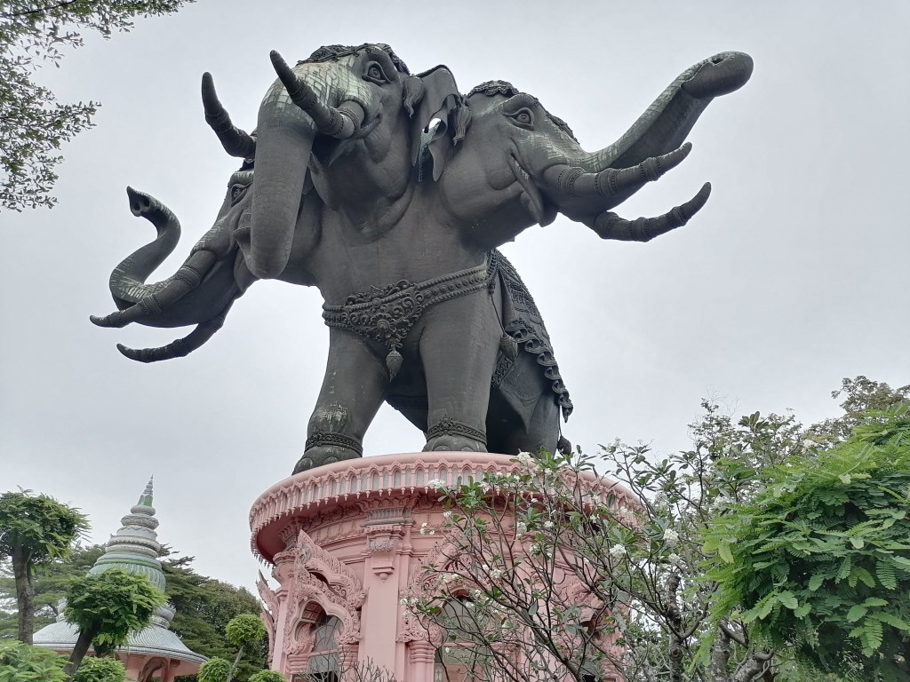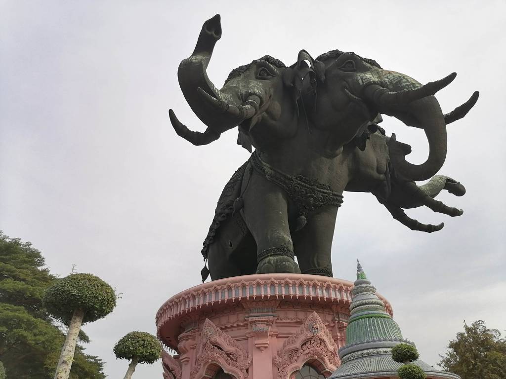 Tämä paikka on sellainen erikoisuus, ettet halua missata sitä! Se on vähän syrjässä, mutta sinne pääsee kätevästi sky trainilla (yläilmoissa liikkuvalla lähijunalla), vaikkakin pysäkiltä on vielä noin vartin kävelymatka (normaalisti sky train -pysäkillä pitäisi olla shuttle-bussi, joka vie Erawan Elephant Museumille). Nimestään huolimatta kyseessä ei ole museo, vaan temppeli. Eikä mikä tahansa temppeli, vaan se sijaitsee jättimäisen, kolmipäisen elefanttipatsaan sisällä!