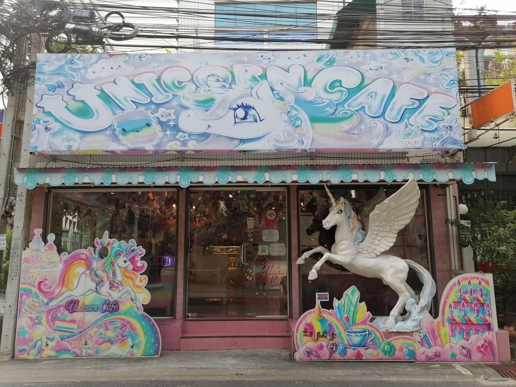Toinen ihana ja ainutlaatuinen teemakahvila. Paikka on täynnä yksisarvisleluja ja -seinämaalauksia ja sateenkaarivärejä, ja maittavat tarjoilutkin ovat sateenkaarenväreissä ja yksisarvisteemalla. Komeuden kruunaavat pastelliväriset sohvat. Normaalioloissa asiakkaat saavat myös pukeutua yksisarvisoloasuihin ja pidellä leluja sylissään, mutta nämä vaihtoehdot ovat poissa käytöstä pandemia-aikana. Kannattaa samalla reissulla vierailla Mahanakhon Sky Walkissa.