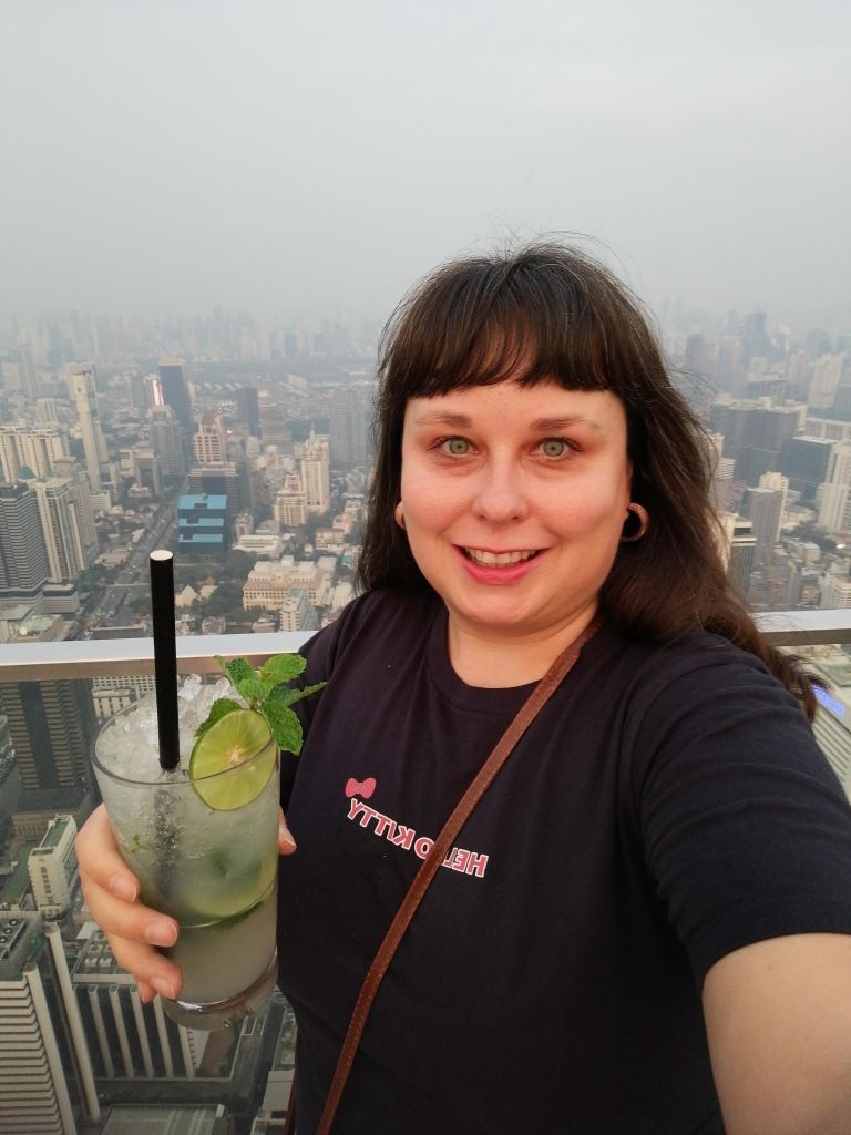 Mahanakhonissa on sisällä kaksi rauhallista näköalakerrosta (74. ja 75. kerrokset), joissa voi katsella alhaalla avautuvaa Bangkokia seinän korkuisten ikkunoiden takaa. Sitten kannattaa vielä nousta lasihissillä kolme kerrosta ylemmäs kattotasanteella, missä on kattobaari (erittäin kallis, joten ostin sieltä vain mocktailin) ja yhdessä kohtaa lasinen lattia. Kävelin lasisella lattialla suojatossut jalassani, mutta minulla ei ole siitä kuvia, koska lasilattialle ei saa tuoda mitään esineitä kuten kännykkää.
