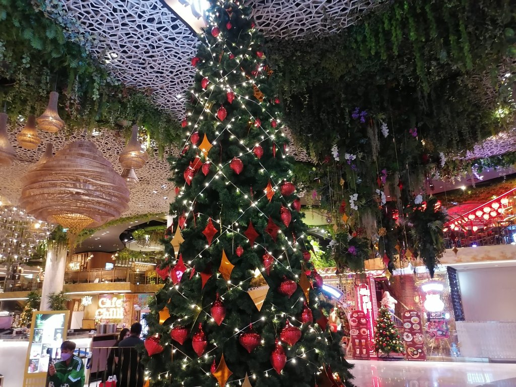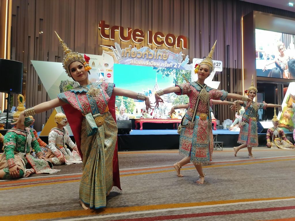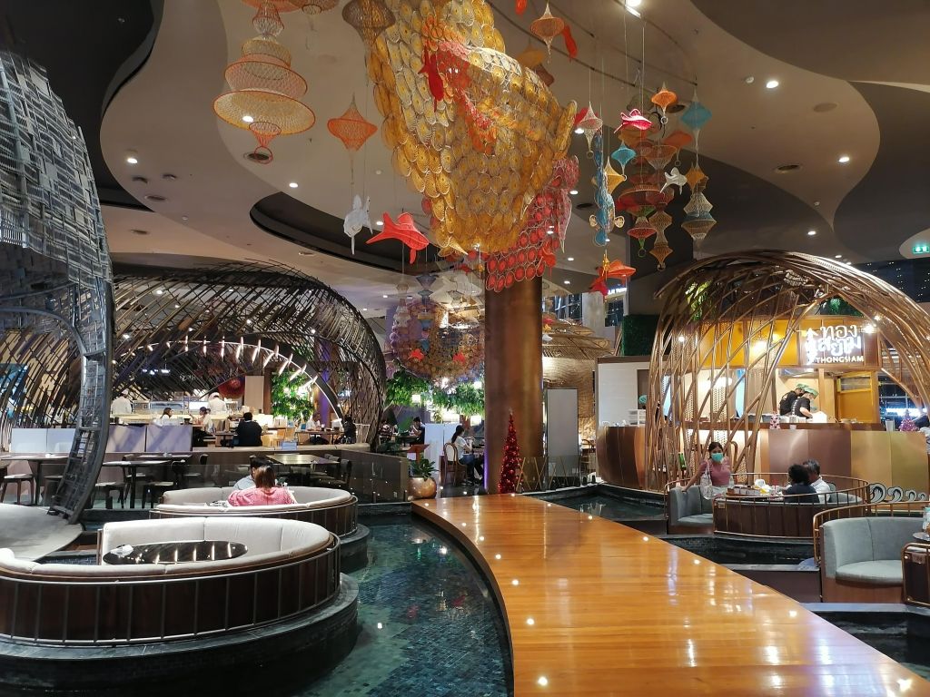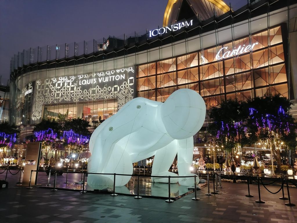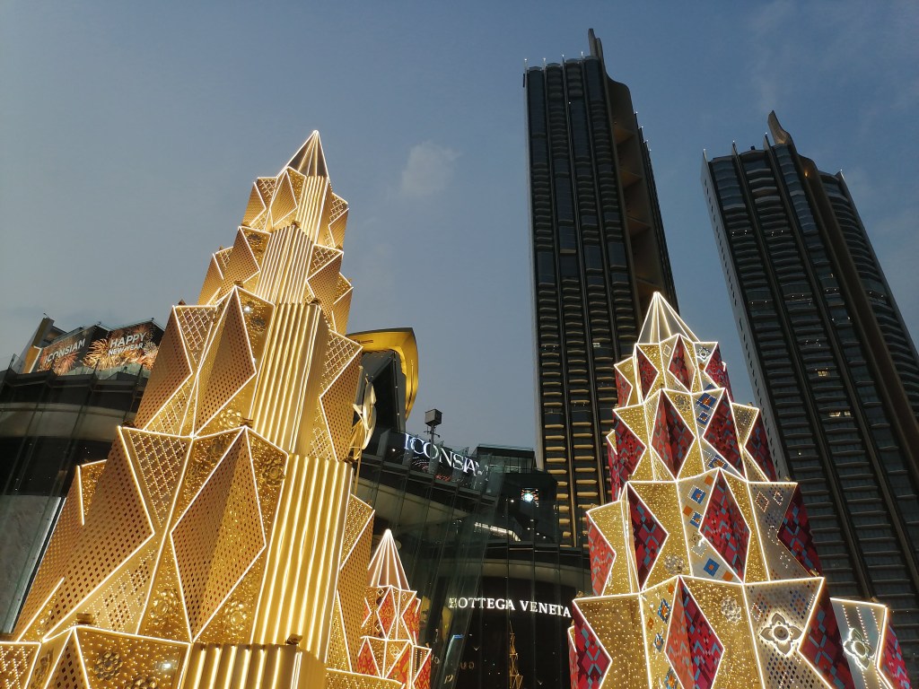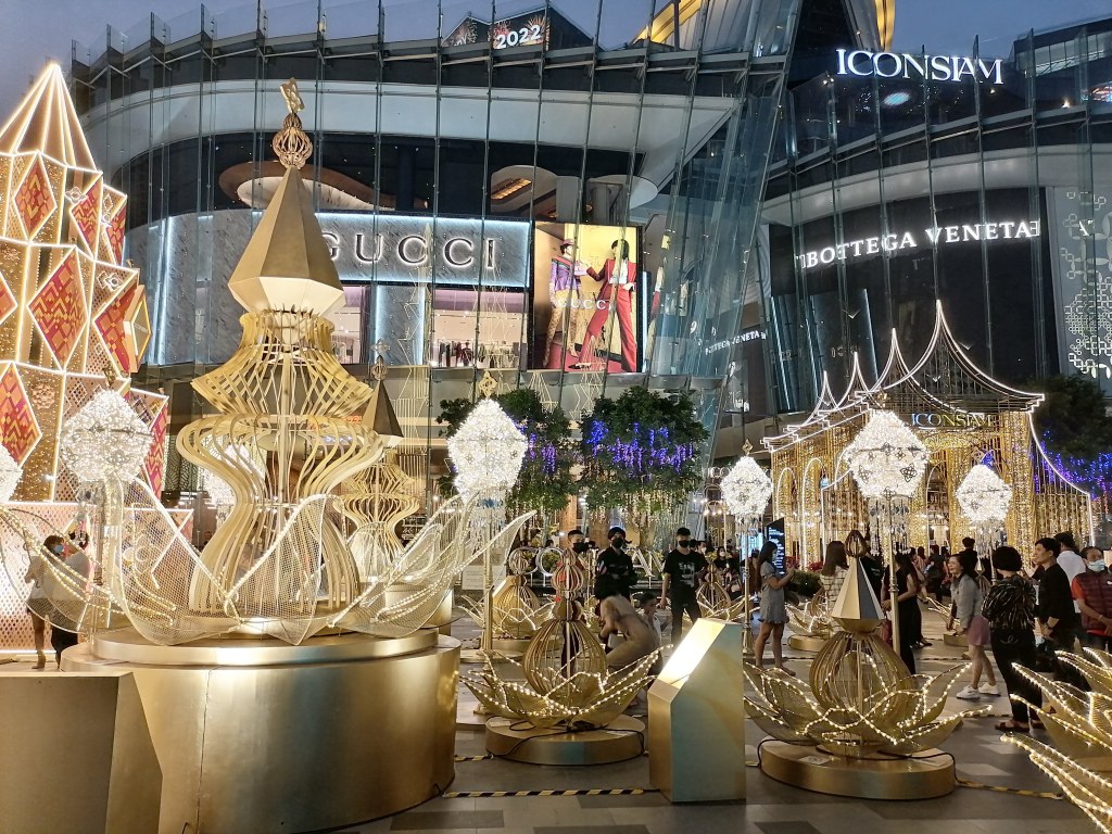 Tässä huimaavan suuressa, elämyksellisessä ja todella ylellisessä ostoskeskuksessa on 10 kerrosta. Erityisen hienoja siellä ovat ostoskeskuksen edusta suihkulähteineen, patsaineen ja juhlapyhien mukaan vaihtuvine koristeineen, katutason aula kukkakoristeineen, myös katutasolta löytyvä thaimaalainen ”yötori” ruokakojuineen ja koristeineen, ylimpien kerrosten (8. kerros?) vesiteemainen kelluva ravintolamaailma, 9. kerroksen terassiravintola ja ylimmän kerroksen tapahtuma-areena, jossa pääsin sattumalta näkemään maksutta lumoavan perinteisen thaimaalaisen tanssiesityksen. Icon Siamissa on enimmäkseen kalliita laatuesineiden ja -vaatteiden kauppoja taas aivan loputtomasti, ja olin huvittunut siitä, kun yhdessä söpöjä esineitä ja vaatteita myyvässä kaupassa oli jopa Lontoosta tutun Harrodsin luksustavaratalon lahjatavaraosasto.