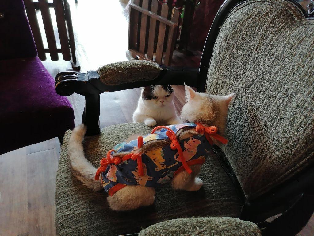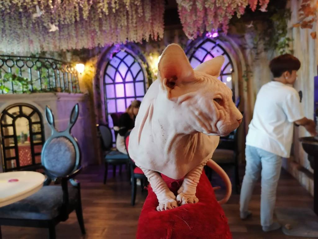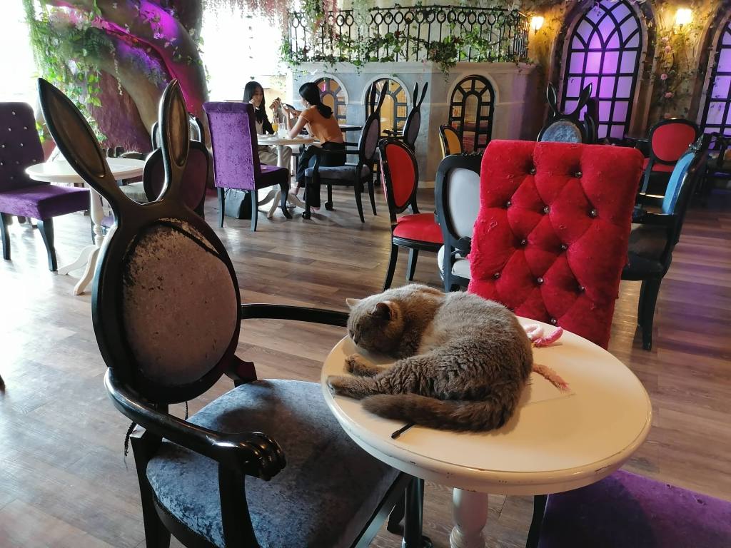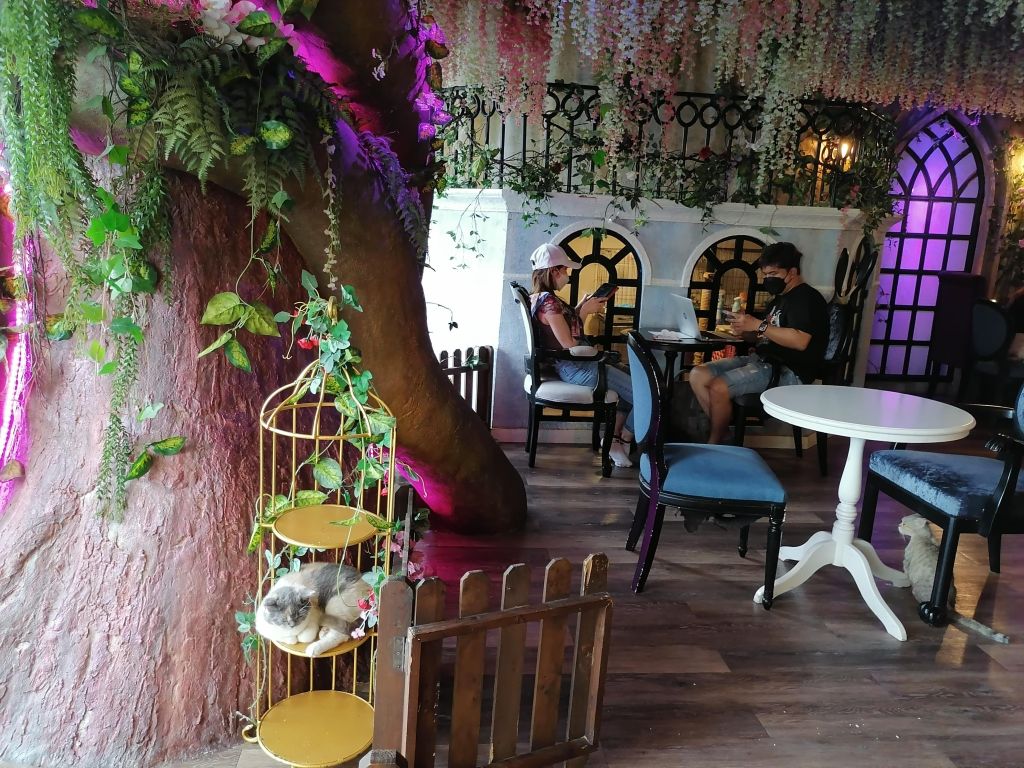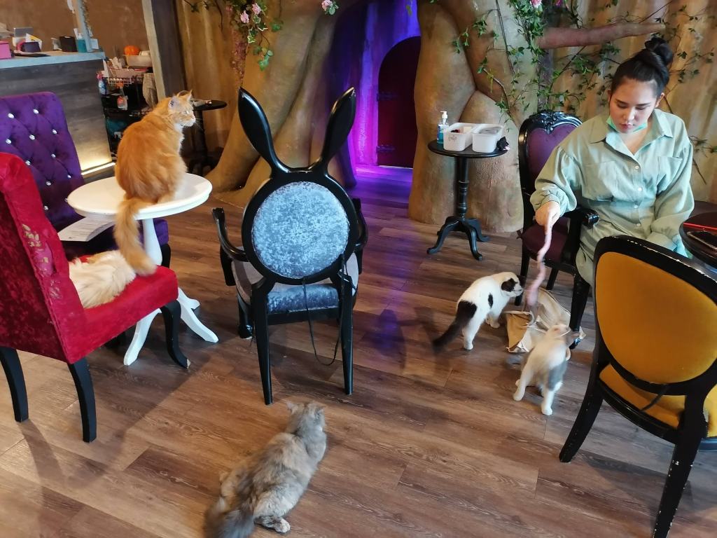 Tässä kahvilassa asustelee jopa 15 erilaista rotukissaa! Suloinen kissakahvila on lisäksi Liisa Ihmemaassa -teemainen. Herkut ovat myös jänniä, kuten ostamani kaakao, jonka kaadoin lasipullosta kupissa olevan suuren hattaran päälle, niin että hattara suli kaakaoon. Kahvila sijaitsee pienen, sademetsäteemaisen Rain Hill -ostoskeskuksen toiseksi ylimmässä kerroksessa ja sinne sipsutellaan lainasukissa pikkuruisen oven läpi. Kävin täällä kahden thaimaalaisen kaverini kanssa, ja he esiintyvät myös kuvissani. Voit myös ostaa kahvilassa kissoille ruokaa, mutta niistä saa kyllä muutenkin helposti seuraa.