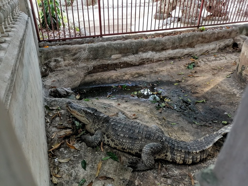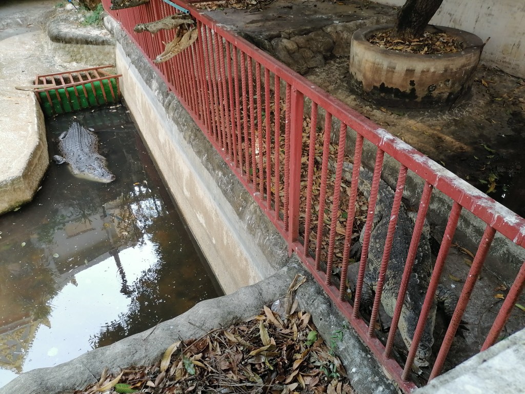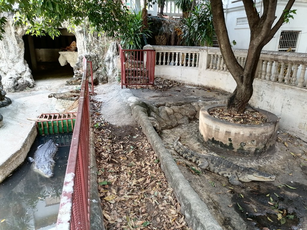 Bangkokissa tosiaan sijaitsee yksi maailman suurimmista China Towneissa, jossa riittää erikoisia temppeleitä, ravintoloita, ostoskeskuksia ja markkinakojuja. Tällä kertaa kävin siellä klaustrofobisen kapeilla ja ruuhkaisilla mutta poskettoman edullisilla ja monipuolisilla Sampheng-markkinoilla (ostin esimerkiksi 80 värikkään kasvomaskin paketin 40 sentillä) ja Wat Chakkrawat Rachawat Woramahawihan -temppelissä eli krokotiilitemppelissä. Temppelin sisäänpääsy on maksuton. Temppeli ei itse ole kovinkaan erikoinen, mutta sen pihalla aitauksessa asustelee kolme suurta krokotiiliä. Urbaanin legendan mukaan krokotiileja ruokitaan tuhmilla munkkikokelailla. Mietin tosin vierailuni jälkeen, että kyseessä oli jälleen sellainen thaimaalainen eläinnähtävyys, joka ei ole kovinkaan kiva eläimille…