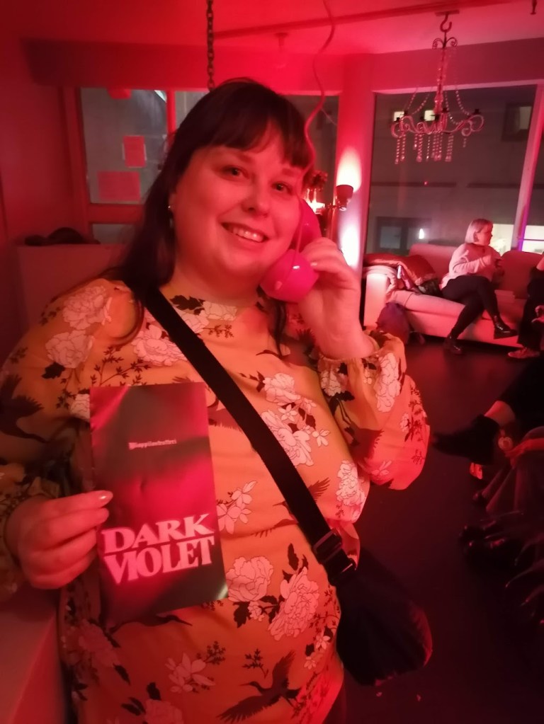 Meidän oli tarkoitus mennä katsomaan Dark Violet tämän viikon keskiviikkona, mutta saimme samana päivänä tietää, että esitys olikin peruttu sairastapauksen vuoksi. Lähes kaikki syyskauden teatterinäytökseni siirtyivät, kun teattereilla on ollut nyt niin paljon sairastapauksia, joten sinänsä peruutus näin vuoden alussa sopi sarjaan. Kuitenkin sairastuneen näyttelijän tilalle saatiin nopeasti sijainen, ja pääsimme katsomaan esityksen jo perjantaina — kauhuteemaiseen esitykseen sopien kyseessä oli vieläpä perjantai 13. päivä. Näytös oli loppuunmyyty, ja teatterissa jännitettiin, mahtuvatko kaikki katsojat saliin, mutta kyllä me mahduimme.