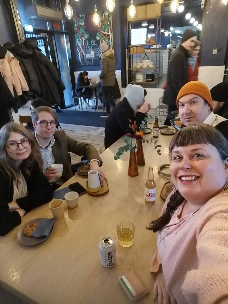 Hyviä ruokailu- ja juomailukokemuksia Tallinnassa olivat nyt (osa oli mulle ennestään tuttuja paikkoja, osa uusia) Telliskivessä Ülo-ravintola, Fika-leipomokahvila ja hiilikaivosteemainen Purtse Tap -panimo sekä Rotermannin korttelissa Gallery Café. Elokuvien välissä söimme Paavon kanssa vain nopeasti monissa elokuvateattereiden lähellä olevissa perusmestoissa, kuten Lido ja Basilika. Kävimme myös ensimmäistä kertaa Telliskivessä hienossa Kopli-vintagekaupassa. Eira ja Markku tutustuivat myös muun muassa trendikkääseen Pohjala-kaupunginosaan, joka on kuulemma rouhea kuin Telliskiven alue 2010-luvulla.