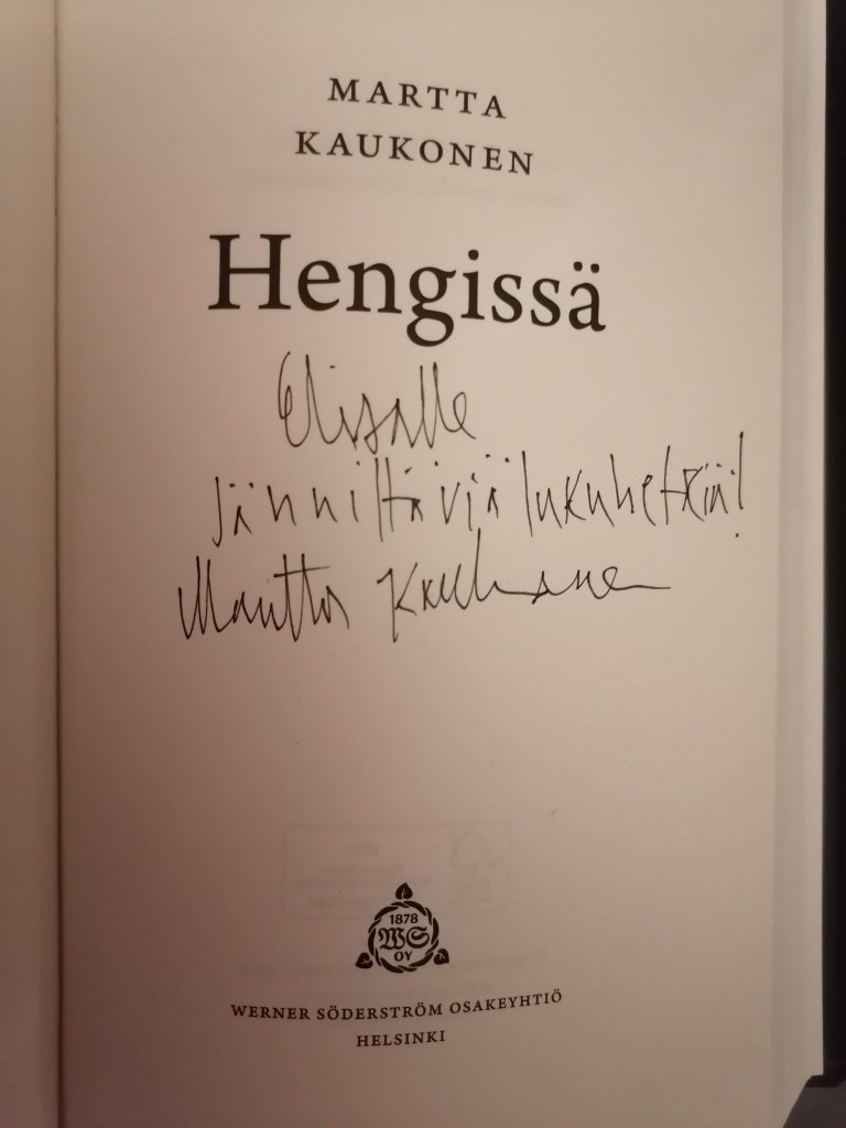 Tapasin ystäväni Martan Helsingin keskustan Akateemisessa kirjakaupassa ja sen kahvilassa ensimmäinen päivä joulukuuta, samana päivänä kun hänen uusin kirjansa Hengissä (WSOY) ilmestyi. Sain lämpimäisen heti käteeni. Ehdin lukea kirjan nyt jouluna, ja teos oli piristävästi niin nopealukuinen ja mukaansatempaava, että luin sen jouluaaton ja joulupäivän aikana vanhempieni luona, kaikkien perherientojen lomassa.