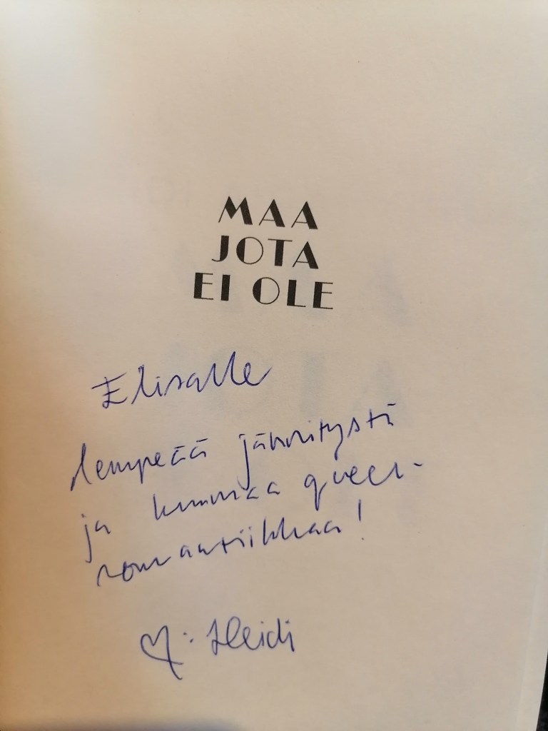 Sain ilokseni kutsun Heidi Airaksisen (s. 1980) Maa jota ei ole (Siltala 2022) kirjan julkaisujuhliin Siltalan toimistolle viime vuoden tammikuun lopulla. Olin kuitenkin hävettävän hidas lukija koko viime vuoden ajan, koska muuta tekemistä oli niin paljon. Olen kuitenkin pikkuhiljaa pienentänyt arvostelukappaleiden pinoa yöpöydälläni. Toisaalta en halua tukea sitä vallalla olevaa kehitystä, että kirjan elinkaari on vain parin kuukauden pituinen, ja sitten sitä ei enää osteta eikä lueta eikä siitä keskustella. Nyt tämän vuoden tammikuun alkupuolella sain aloitettua Heidin romaanin, ja se oli viihdyttävä ja avartava lukukokemus.