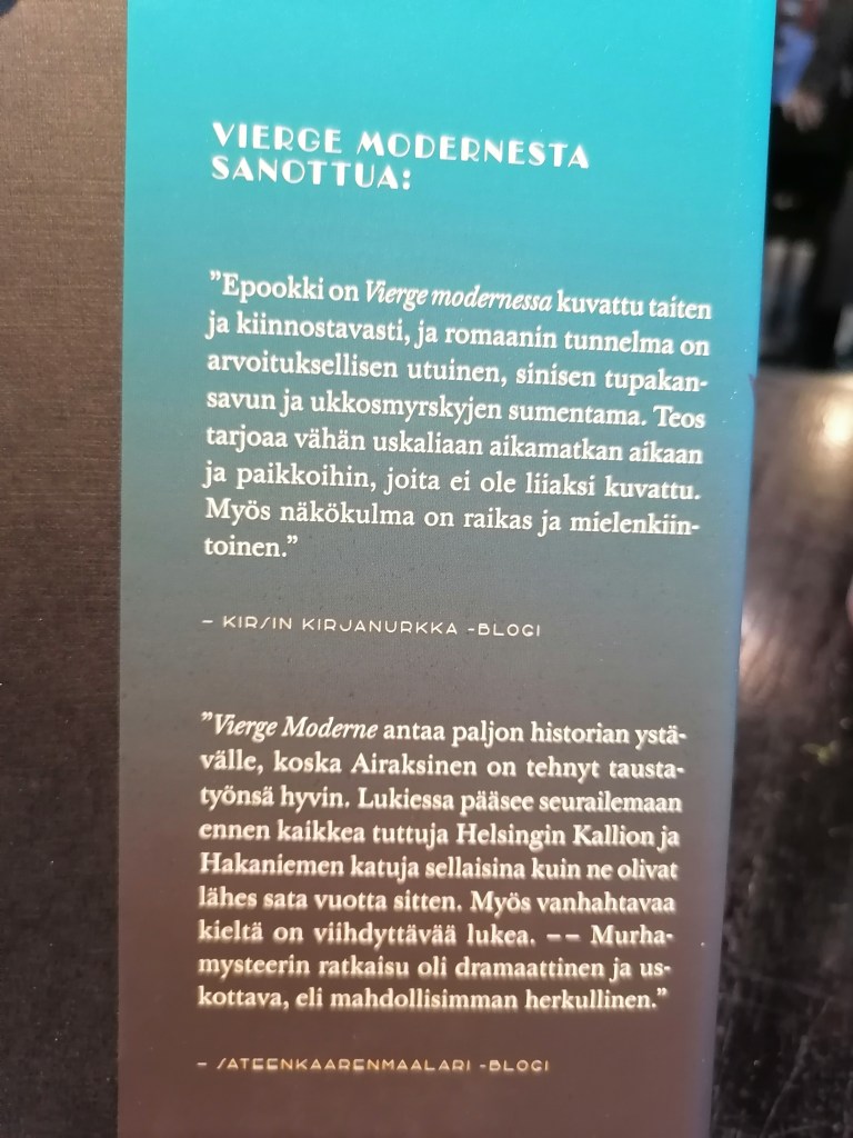 Olen huhtikuussa 2021 arvioinut täällä blogissani Heidin esikoisromaanin Vierge Moderne (Arktinen banaani, 2021). Lue arvio täältä. Kummatkin kirjat ovat historiallisia murhadekkareita queer-hahmoilla, ja niissä seikkailee osittain samoja hahmoja. Vierge Moderna sijoittuu kuitenkin 1930-luvun Helsinkiin ja Maa jota ei ole taas vuoden 1927 Berliiniin.