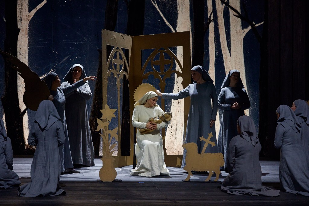 Lavastus ei ole silti pelkistetty, vaan näyttävä. Aluksi markiisin asuntoa esittää puinen musta ”laatikko”, mutta seinät aukeavat sitten ristiksi ja vielä metsäksi, jossa on koko näyttämön korkuisia paksuja puita. Prioritar Mademe de Croissyn (Anna Danik) kuolinvuode luostarissa on kiinnitetty takaseinään, joten näemme, kuinka hän ”makaa” vuoteessa. Kekseliäitä ja hienoja ovat myös pahviset lavasteet, joilla nunnat muodostavat seimikuvaelmia. Yhdenmukaisissa asuissa olevat nunnat luovat hienoja joukkokohtauksia.