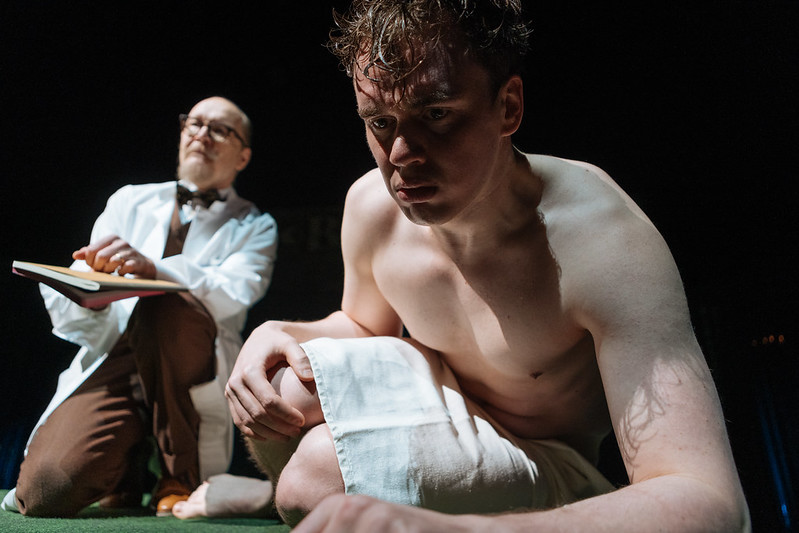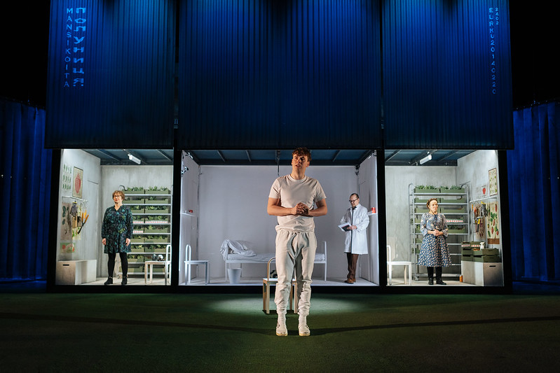 Esitys ei heti napannut minua mukaansa, koska se tuntui hieman jähmeältä. Näyttelijät piipertävät konteissaan ja niiden edessä, sekä Moskovan-kohtauksessa psykiatri on selin yleisöön ja kontissa / suljetulla osastolla oleva Ville taas nähdään videokuvan välityksellä.