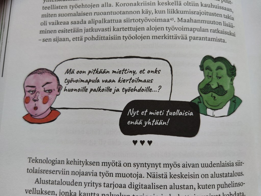 Kirjan ovat tehneet yhdessä kulttuurialan parikymppinen power couple Tampereelta, eli piirtäjä ja yhteiskuntakriitikko Tanskanen (s. 1998) ja valtio-opin jatko-opiskelija, kirjoittaja ja aktivisti Samu Kuoppa (s. 1995). Teoksessa on Tanskasen hauskoja ja runsaan yksityiskohtaisia kuvituksia ja muutamia sarjakuvia. Olen vaikuttunut siitä, että he molemmat ovat jo noin nuorina niin oppineita ja aikaansaavia. Tavallaan he ironisesti toteuttavat kapitalistisen ihanteen työteliäästä ja tuloksellisesta elämästä, vaikka kirjassaan myös kritisoivat sitä.