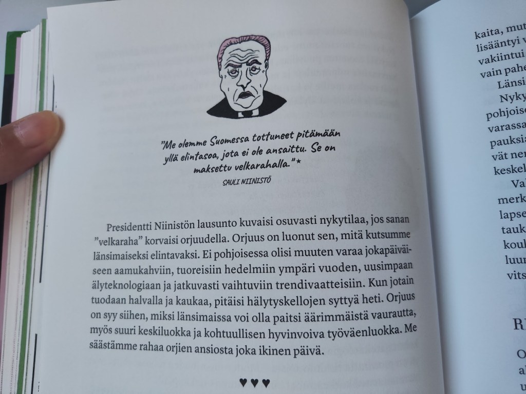Kaikista hurjinta oli kuitenkin lukea, että ”[t]ällä hetkellä orjia on yli kolme kertaa enemmän kuin koko avoimen orjatalouden 350 vuoden aikana. Varovaistenkin arvioiden mukaan noin 50 miljoonaa ihmistä elää modernissa orjuudessa. Moderni orjuus koostuu pakkotyöstä ja pakkoavioliitoista. – – Naiset kattavat yli 70 prosenttia modernin orjuuden uhreista – -”. Kammottavaa! Ja tämäkin nyrjäyttää ajattelua: ”Orjuusriskin alla tuotetut tavarat kulutetaan pääsääntöisesti rikkaissa maissa. – – Kuvaavaa on, että pohdiskelemme vauraassa pohjoisessa, onko meistä tullut älypuhelimiemme orjia samaan aikaan kun niiden takaa löytyy ihan oikeaa orjatyötä.” Kirja saa näkemään, että se on rasismia, että elintasomme taustalla on se, että suuri osa käyttötavaroistamme tuotetaan modernin orjuuden oloissa.