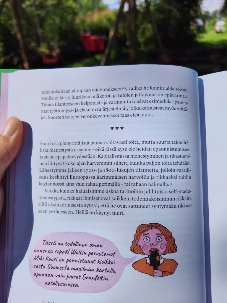 Kirja sisältää myös todella kovan poliittisen ja taloudellisen tietopaketin, minkä takia lukeminen vaatii paljon pureskelemista ja miettimistä. Kuitenkin teksti on kirjoitettu helposti ymmärrettävään ja menevään muotoon, eli se ei ole mitenkään vaikeaselkoista tai koukeroista. Lähes joka sivulla sain ahaa-elämyksiä ja sanoituksia kokemuksilleni ja tunteilleni. Nytkin tuntuu, että tästä kirjasta on vaikea tehdä postaus, koska sain kirjasta niin valtavan paljon oivalluksia, sanoituksia epämääräisille kokemuksilleni ja kirkkaita näkökulmia yhteiskuntaan.