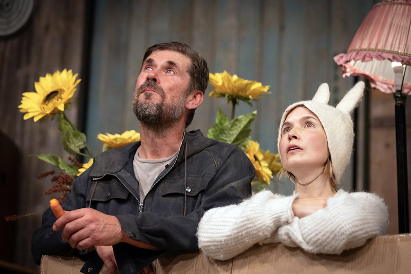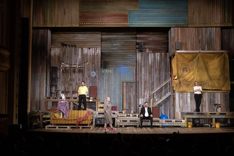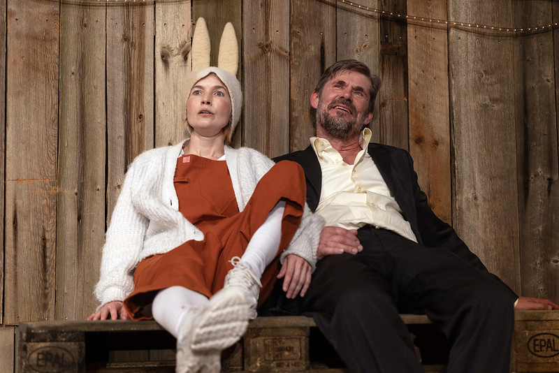 Laudoista koottu lavastus vie ajatukset sopivasti heinälatoon. Kiehtovasti toteutetussa lavastuksessa seinässä on eri korkeuksilla ovia, joista näyttelijät tupsahtavat esille. Lavalla on jopa sauna, jonka kiukaasta sihahtelee paljon savua. Toinen puoliaika alkaa taas vaikuttavasti salia tärisyttävillä, uhkaavilla kumahduksilla, ja koko takaseinän korkeuden täyttävällä livevideokuvalla itkevän jäniksen eli Salon kasvoista.