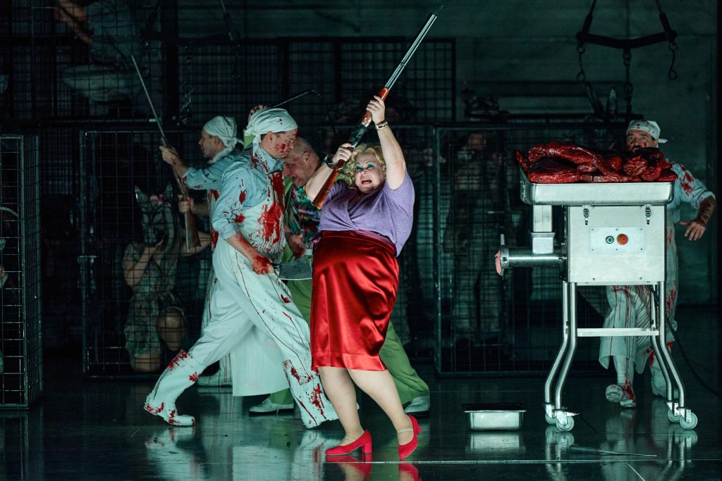 Näky on kyllä hätkähdyttävä, kun oopperan alkaessa esirippu nousee, ja lavalla on häkkejä, joissa maatalon eläimet ovat vankeina kuin keskitysleirillä. Tehtaan työntekijöillä on kauhuelokuvamaisen veriset esiliinat. Makaaberista jauhelihakoneesta puristuu ulos vaaleanpunaista lihamössöä. Toisella puoliajalla katosta roikkuu parimetrinen lehmän raato. Mieleen ei voi olla tulematta, että teos ottaa ainakin näin nykyajan tulkintana kantaa myös eläinten julmaa tehotuotantoa vastaan, vaikka varsinaisesti tarinassa ei olekaan ekologisia eikä eläinoikeudellisia teemoja.