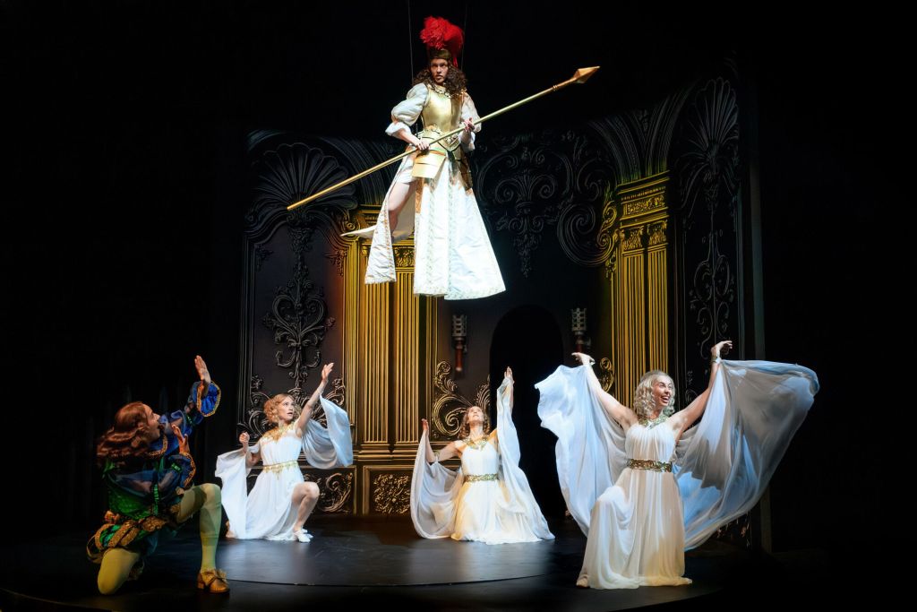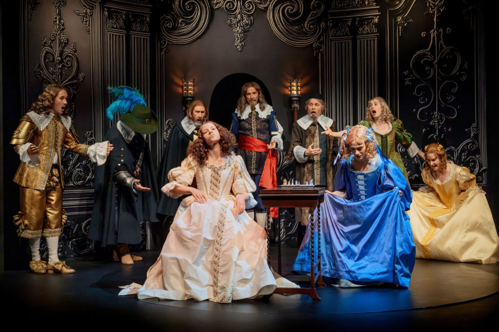 Pidin myös kohdasta, jossa muinaiseen kreikkalaiseen sota-asuun sonnustautunut Kristiina nousee yläilmoihin ja lavalla on myös hovineitoja muinaisissa kreikkalaisissa asuissa, kuvaamassa Kristiinan kiinnostusta filosofiaan ja historiaan. Kuningatar oli tiedonjanoinen sekä halusi sivistää ja eurooppalaistaa Ruotsia. Tämän takia hän esimerkiksi kutsui hoviin vieraaksi ranskalaisen filosofin René Descartesin, jonka teoriat sukupuolten synnystä ovat tosin aika mielikuvituksellisia, eivätkä ihan uppoa Kristiinaan ja Ebbaan. Näytelmä ei onneksi kumartele suurmiehiä.